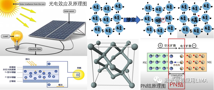 想要搞清楚光伏电池的产业链,首先我们需要明白太阳能如何转换成电能并产生电流的,这就涉及到上面的光电效应和PN结构。如下图所示,PN结是一种半导体器件结构,由P型半导体和N型半导体通过界面连接而成。其原理基于半导体材料中的载流子浓度差异和能带结构的变化。P型半导体中的杂质原子(如三价元素)掺杂使得半导体中存在多余的正电荷,形成少数载流子为正电荷的空穴(正空穴)。N型半导体中的杂质原子(如五价元素)掺杂使得半导体中存在多余的负电荷,形成少数载流子为负电荷的自由电子。当P型和N型半导体相接触形成PN结时,发生以下现象: