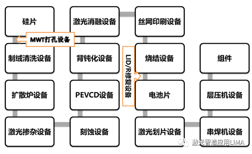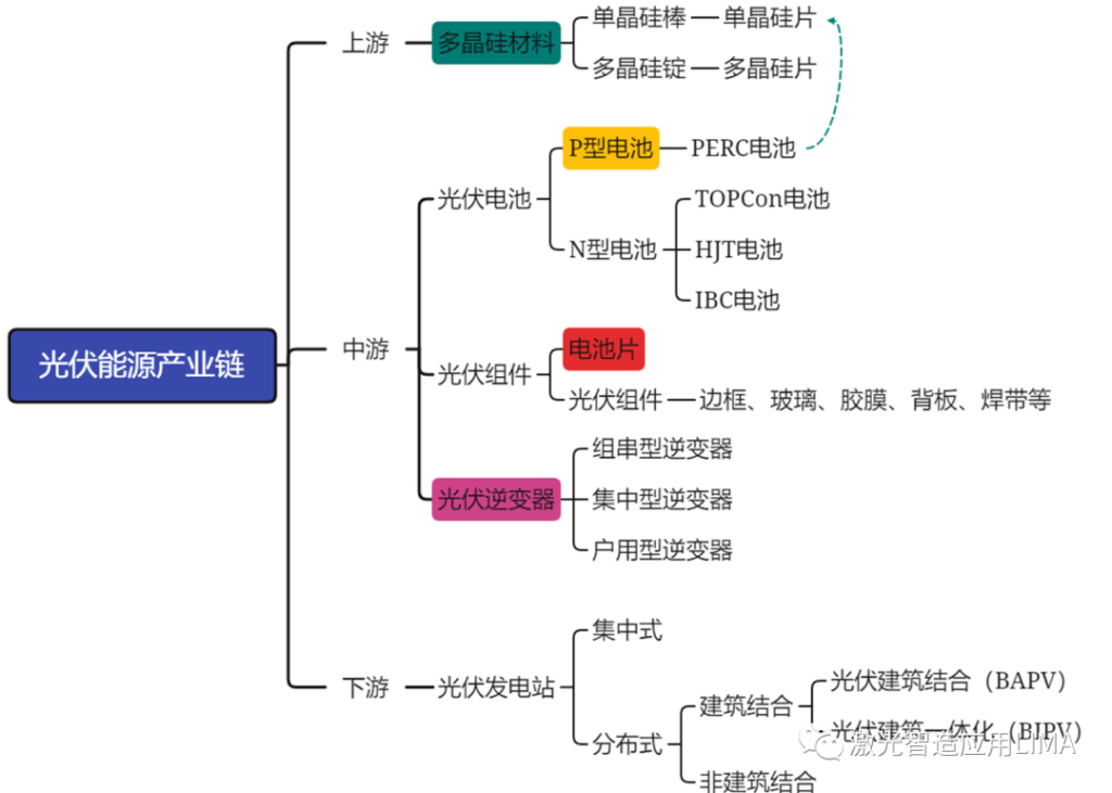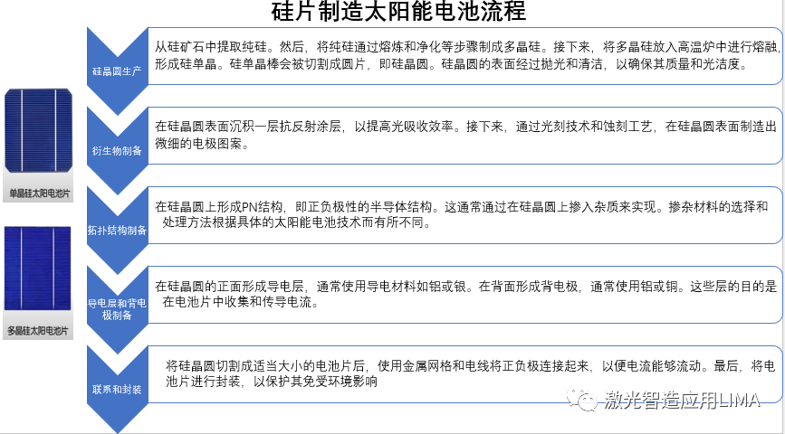 1. 激光技术在光伏组件制造中的应用激光技术在光伏组件制造过程中扮演着重要角色。首先,激光可以用于晶体硅切割,通过精确控制激光切割参数,可以实现高效、低损耗的硅片切割,提高光伏组件的效率和产量。其次,激光还可以用于光伏电池的制作过程中,通过激光刻蚀技术,可以实现对电池表面的微纳结构加工,提高光的吸收效率,增加光伏电池的输出功率。(1.电池边缘钝化处理2. 激光排列划线3.激光切割划片4.硅片激光标记5.激光烧蚀)2. 激光技术在光伏组件检测中的应用激光技术在光伏组件的质量检测和缺陷分析方面也发挥着重要作用。利用激光光谱技术可以对光伏组件进行非接触式的快速检测,判断组件的性能和工作状态。激光还可以用于光伏组件的热成像检测,通过检测组件的热分布,可以及时发现和修复故障,提高光伏系统的可靠性和效率。