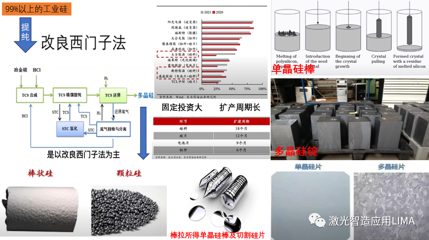 往下,可以进行光伏能源产业链的介绍,如图2所示为整体的结构关系。首先在产业链的上游是多晶硅材料,其技术门槛较高,具有一定的垄断性。硅料是制作光伏电池的主要材料,目前主要用石英和焦炭在电热炉内冶炼成纯度为99%以上的工业硅,再通过改良西门子法进行提纯。该行业主要有:固定投入大、技术堡垒高(光伏级硅料纯度在99.9999%-99.999999%)、扩产周期长(其竞争格局相对稳定,后来者很难进入并立足)等三大特点。工业生产并提纯后的硅料主要以棒状硅和颗粒硅的形成存在。颗粒硅需要通过棒拉的方法制作单晶硅棒,首先需要将多晶硅和掺杂物熔化,向熔融物中放入晶种,晶种开始生长,然后开始向上提拉棒,并与下面的熔融物反向旋转直到单晶硅生长完成,就可以开始切割成硅片,如下图所示。多晶硅锭就是让熔化的多晶硅形成一个一个的长方体形状。二者对比图已经列出。光伏构建的成本中电池片占65%,而电池片的成本中硅片又占据大头,因此,未来的硅片发展主要以提效降本为目标进行发展。而降本主要是硅料成本和非硅成本,硅料成本由市场价格决定,一般较为稳定。非硅成本可以朝着大尺寸和薄片化方向发展(210mm(新厂家)和182mm(老厂家))。提效主要就是提升光电转化效率,主要是从P型电池往N型电池进行转变。