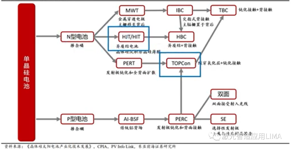 有了硅片之后就可以进行电池片的制作,其制作流程图如下图所示。往下主要介绍单晶硅电池的技术路线,目前主要以P型电池的PERC为主,并占据绝对主导地位,但是其理论光电转换效率为24.5%。目前主流厂商能做到23%以上,部分高档的能做到24%,以致于其没有更大的发展空间。于是开始往N型电池上发展,其中TOPCon和HJT(理论极限27.5%)成为了主流发展。TOPCon可以通过传统的PERC产线升级改造,但是相对于只有4道工序的HJT电池其工艺更加复杂,有12道工序。但是更少的工序并不意味着更低的成本,HJT电池需要用到低温银浆(成本比高温银浆(TOPCon用)高10%-20%)并且还以来进口设备。但是随着我国科技的发展,相信更多的技术和难题将被突破,实现国产化后,成本自然会降低更多。繁琐的工艺流程导致其良品率仅为93%-95%,相比于PERC97%-98%的良品率更低。另外HJT还可以和钙钛矿电池叠加达到29%的理论转换效率,而TOPCon则不能与其叠加。综合来看TOPCon赢在当下,HJT赢在未来。