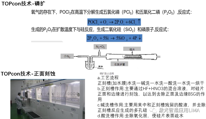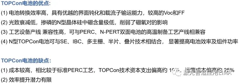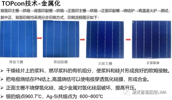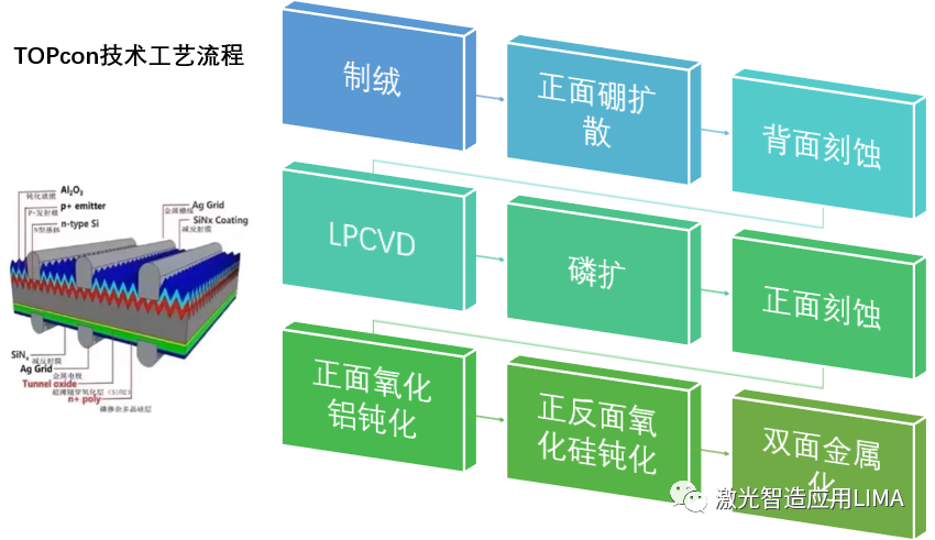 近年来,全球光伏市场持续增长,光伏发电容量不断扩大。光伏技术已经在许多国家成为主要的电力来源之一。光伏技术广泛应用于家庭、商业和工业领域。在家庭领域,光伏系统可以帮助实现自给自足的电力供应;在商业和工业领域,大型光伏电站可以提供清洁能源供应。光伏电站的建设涉及选址、工程设计、设备采购和安装等多个环节。运营期间,对光伏电站的监测、维护和性能优化也至关重要。光伏技术作为可再生能源之一,具有显著的环境优势,可以减少温室气体的排放,改善空气质量,并减少对有限资源的依赖。光伏技术在能源转型中扮演着重要角色,可以推动能源结构的转变,减少对化石燃料的依赖,实现可持续发展。尽管光伏技术取得了显著的进展,但仍面临一些挑战,如高成本、能源储存、光伏电池效率的限制等。近年来,一些新兴的光伏技术和材料引起了广泛的研究兴趣。例如,钙钛矿太阳能电池被认为是下一代高效光伏技术,具有较高的光电转换效率和较低的制造成本。有机太阳能电池则具有灵活性和可塑性的优势,可以应用于曲面和柔性设备。随着光伏技术的成熟和普及,光伏系统集成和智能化管理成为一个重要的发展方向。通过将光伏系统与能源储存系统、智能电网和能源管理系统相结合,可以实现对能源的更高效利用和优化。光伏技术在能源转型和可持续发展方面有巨大的前景。随着技术的进一步发展和成本的进一步降低,光伏发电将成为全球能源供应的重要组成部分,并对减缓气候变化和提高能源安全性发挥重要作用。以上对光伏技术有了简单的了解,也可以结合上一篇公众号–光伏能源产业链及激光技术应用–进行结合。下面对光伏电池中现阶段较火的TOPcon电池进行一些简单的介绍