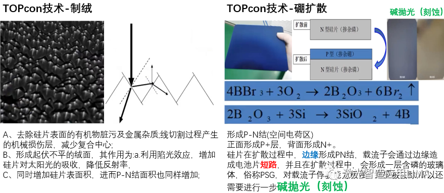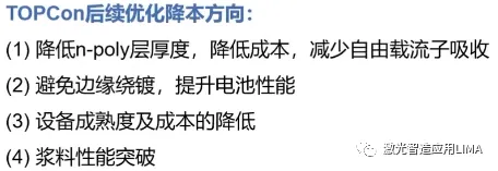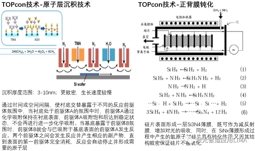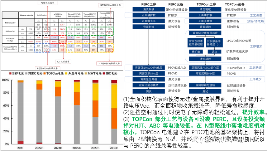 3. 可靠性:TOPCon电池通过使用高品质的隧道氧化物薄膜,降低了电池中电子与杂质的反应,减少了电池在长期使用中的退化和性能损失。TOPCon 在 PERC 电池基础上技术深化的核心是钝化,由“隧穿效应”通过隧穿氧化层实现。“隧穿效应”是指在量子尺度上,粒子直接穿过障碍物的“穿墙术”,TOPCon 电池的“墙”就是衬底背部的超薄氧化硅层。在界面浓度合适的情况下,这层超薄 SiO2 的存在形成一道单向拦截,使得电子可以通过,但是少子(即空穴,流失电子所留下的空位)却不行。隧穿氧化层保证了电流的通畅,又缓解了正负电荷的复合,使得电池的开路电压升高。超薄二氧化硅隧穿层和掺杂多晶硅薄膜共同构成钝化接触结构,也称为电池背面钝化层。高掺杂的多晶硅层与 N 型硅基体间功函数差异引起界面处能带弯曲形成势垒,减少电子和空穴的复合,起到良好的化学钝化作用。除了电池机构本身的特点,TOPCon 部分工艺与设备可沿袭 PERC,且设备投资额相对 HJT、ABC 等电池较低,在 N型路线中落地难度相对较小。TOPCon 是一种基于选择性载流子原理的隧穿氧化层钝化接触(Tunnel Oxide Passivated Contact)太阳能电池技术,可大幅提升 N 型电池的 Voc(光伏组件的开路电压)和转换效率。工艺路线差异主要体现在多晶硅生长及氧化层的制备上,目前主流的技术方案包括 LPCVD、PECVD、PVD 等。高质量的超薄氧化硅和重掺杂多晶硅的叠层结构,对全背表面实现了高效钝化,同时载流子选择性地被收集,具有制备工艺简单、使用 N 型硅片无光致衰减问题和与传统高温烧结技术相兼容等优点。TOPCon 电池建立在 PERC电池的基础架构上,将衬底由 P型转换为 N型,并形成了背面钝化接触结构,所以与 PERC 的产线兼容性较高。4.TOPcon光伏电池工艺流程