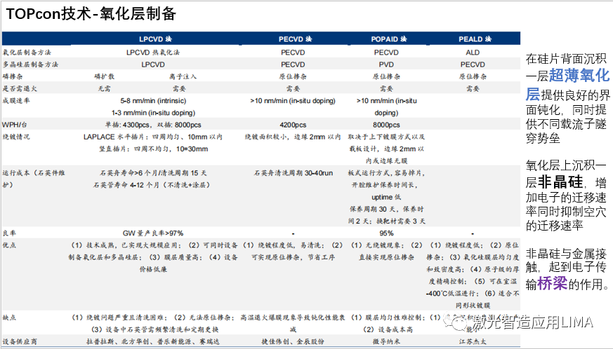 钝化接触层制备是 TOPCon 电池的核心工艺。TOPCon 电池与常规 N 型电池的前表面结构相似,关键区别在于后表面:TOPCon 电池生产中会在 N 型硅片的背面沉积一层 1-2nm 的氧化硅膜和一层 100-150nm 的掺杂非晶硅薄膜,非晶硅薄膜在后续退火过程中结晶性发生变化,由微晶非晶混合相转变为多晶,激活叠层薄膜的钝化性能,在叠层薄膜上沉积金属,就可以得到无需开孔的钝化接触结构。隧穿层氧化硅膜的主流制备方法包含 LPCVD、PECVD 和 ALD,多晶硅层的制备从工序角度分为原位掺杂和非原位掺杂,制备方法包括LPCVD、PECVD、PVD 等。LPCVD 为当前量产玩家主线,PECVD 为新玩家扩产主流选择。目前,LPCVD 技术路径相对更为成熟,当前已成功量产 TOPCon 的工艺以 LP 路线为主,代表公司为晶科能源、钧达股份,设备供应商为拉普拉斯和北方华创等。2022 年下半年,PECVD 路径得到行业内的广泛关注,以通威股份、天合光能和晶澳科技为代表的新 TOPCon 厂商纷纷加码PECVD 路径的产能,设备厂商主要为捷佳伟创、红太阳和金辰股份等。
